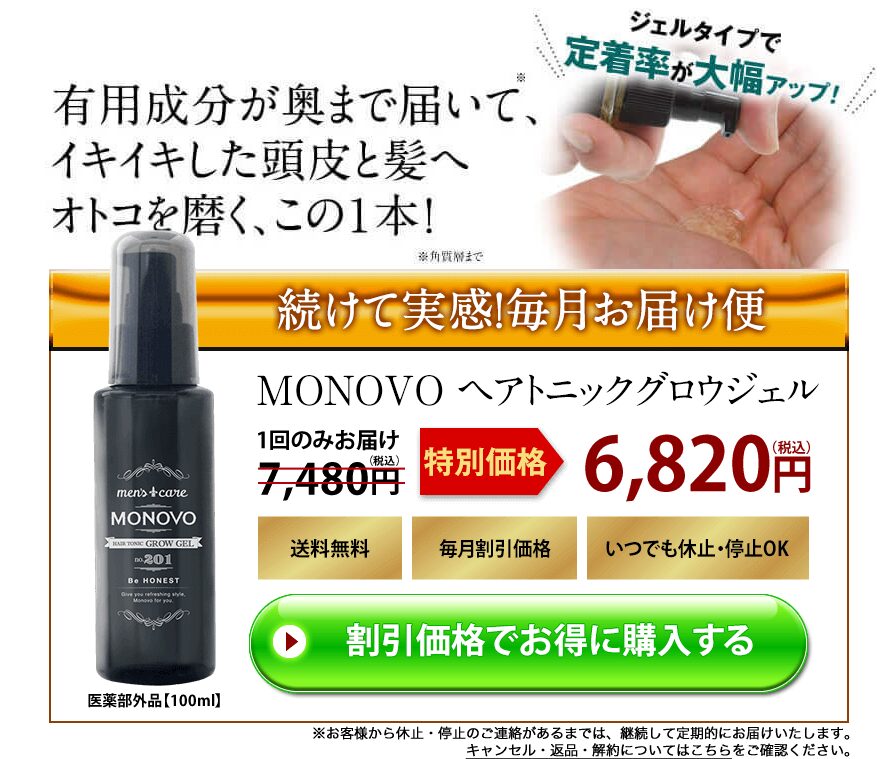 MONOVOヘアトニックグロウジェルは、薄毛や抜け毛が気になる男性に特におすすめです。実際に多くの人が愛用していて、継続しやすい使い心地も高評価。